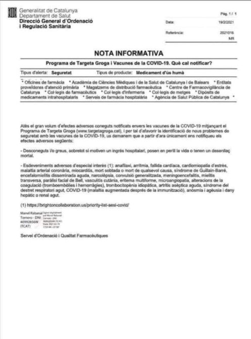 “En vista del gran volumen de efectos adversos conocidos notificados sobre las vacunas del COVID-19 mediante el programa de Tarjeta Amarilla (www-targetagroga.cat), y para favorecer la identificación de nuevos problemas de seguridad con las vacunas de la COVID-19, os pedimos que, a partir de ahora, únicamente nos notifiquéis los efectos adversos siguientes: